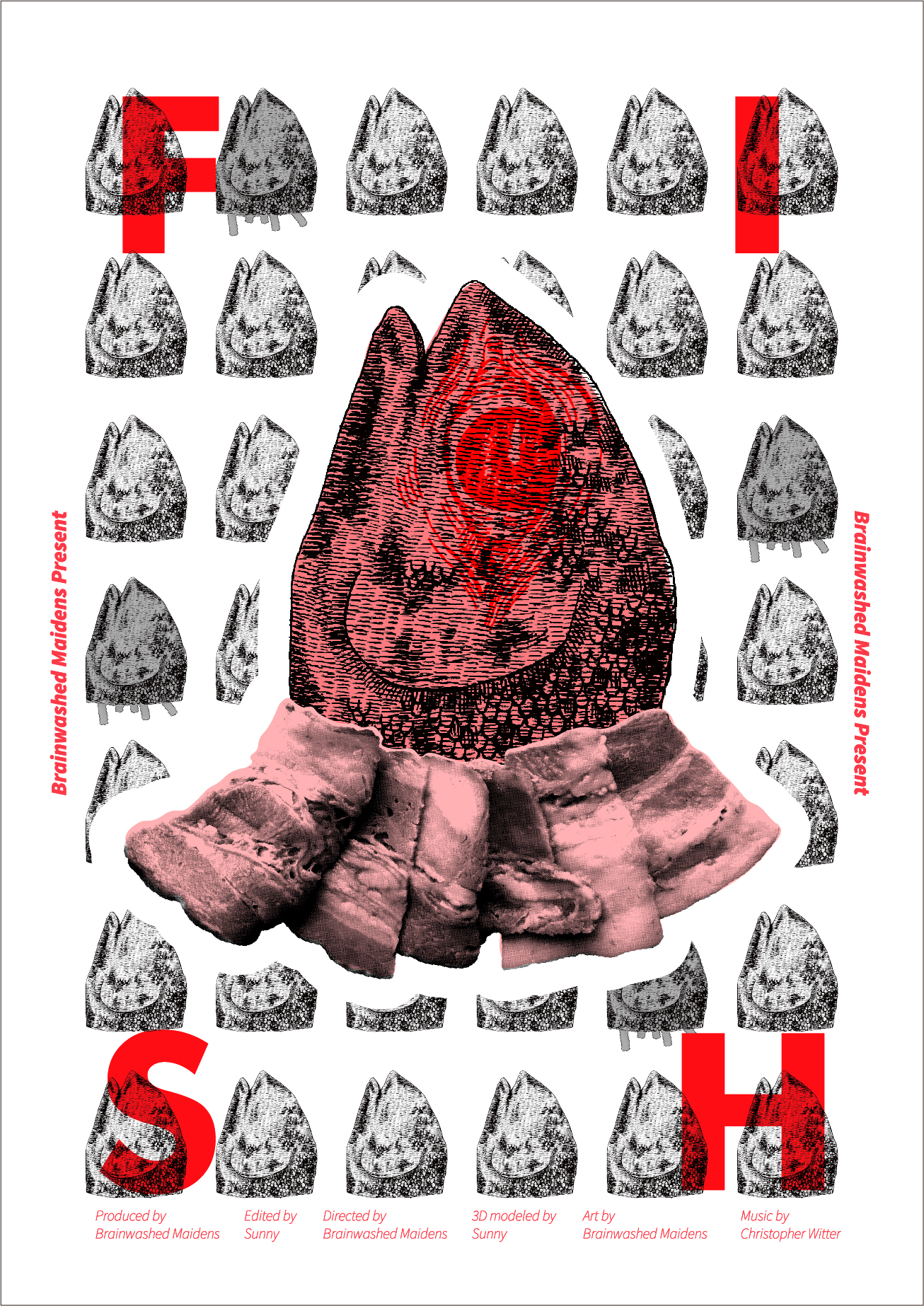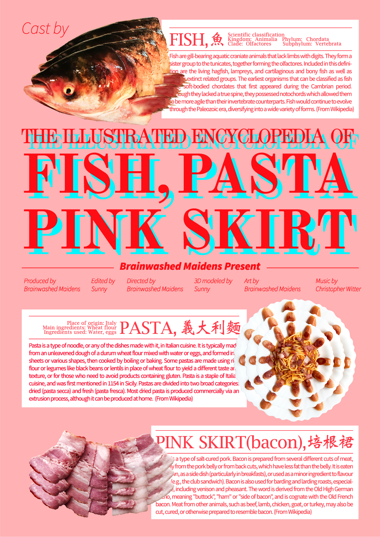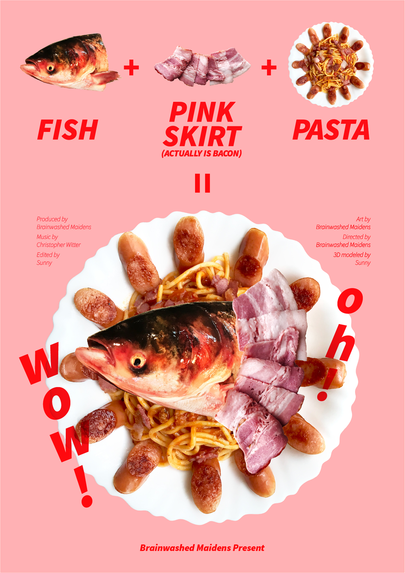 “A Fish head wearing pink skirt” tells a story about a fish head wearing pink skirt suddenly grew out pasta, and eventually became a dish of marinara fish head pasta while the pink skirt turned to bacon.